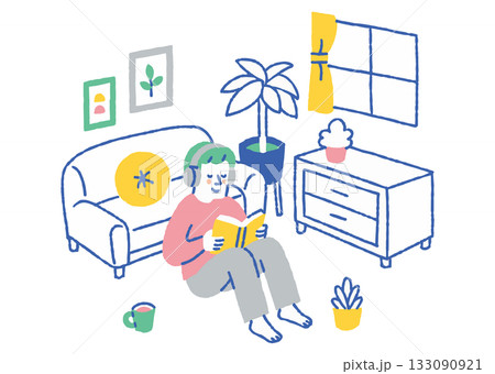 ソファに座って本を読む女性のイラスト素材