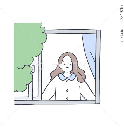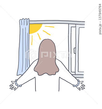 窓を開けて深呼吸をしている後ろ姿の女性のイラスト素材