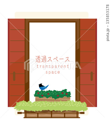 窓のフレーム素材:青い小鳥とプランター、透過スペースのある窓辺