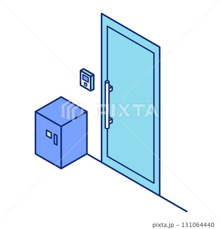 配達された荷物を保管する宅配ボックスが置かれた玄関前のアイソメトリックイラスト