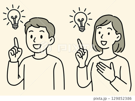 閃きを表す大きな電球と、いい案を思い付いた表情の若い夫婦・カップルの上半身イラスト素材