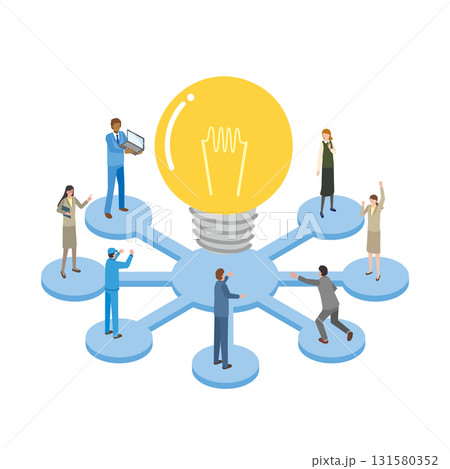アイデアブレストのイメージイラスト 大きな電球の周りに集まって座る人々