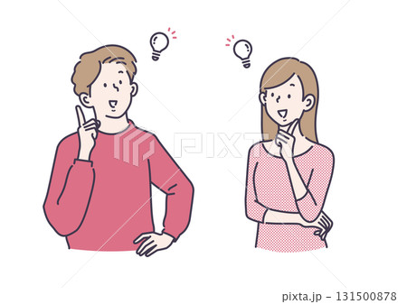 上を指差す女性と腕組みしてひらめく男性の若い夫婦のイラスト