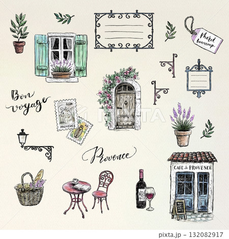 クラフト紙風背景のプロヴァンスカフェ・旅アイテム 手描き水彩イラストセット