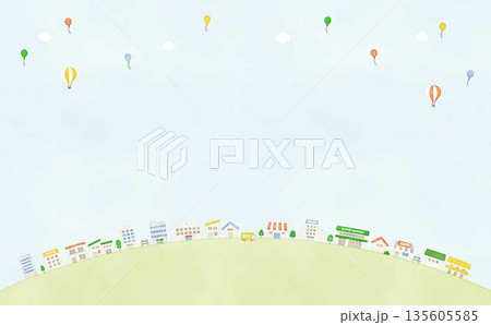 水彩風 かわいい街並みの背景イラスト素材 横長 コピースペース