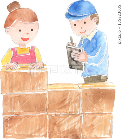 端末で確認しながら荷物を受け渡す配送業者の男性 宅配サービスのイラスト