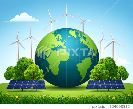 樹木、風力タービン、ソーラーパネルに囲まれた緑の惑星のイラスト