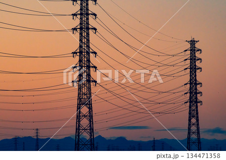 夕空に見上げる送電線鉄塔 暖色 高彩度コントラスト
