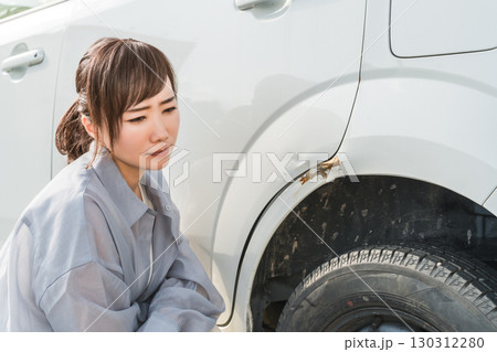 タイヤのトラブルを確認する若い女性