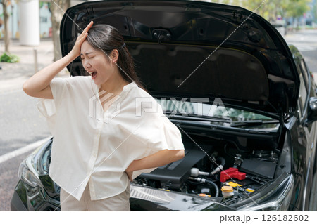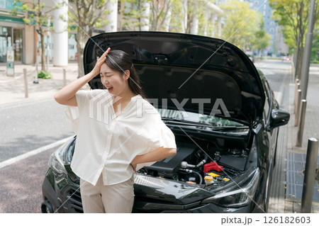 車が故障して困った様子の若い女性ドライバー