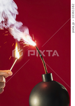 Old-fashioned explosive device ready to go off with hand holding burning match