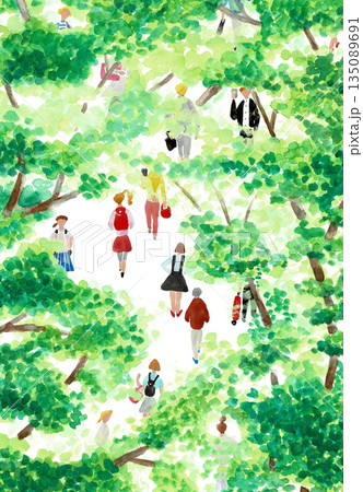 手描き水彩イラスト 新緑の木々の下を行き交う人々