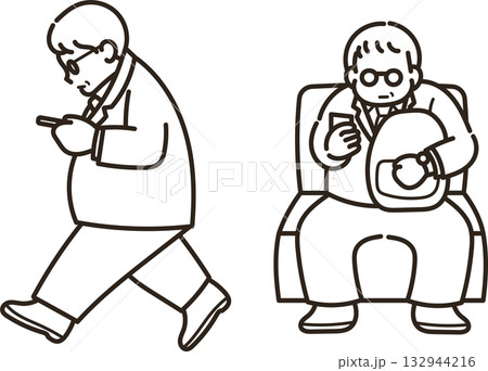 歩きスマホ、座ってスマホをいじる50代のビジネスマンのイラストセット 線画のみ