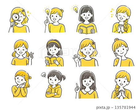 シンプルな線画のアイコン 顔のみ 女性6人セット 色塗り有