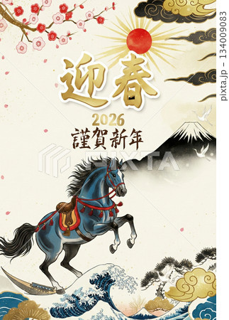 年賀2026 年賀状 2026 午 午年 馬 うま年 干支 墨絵 水墨画 水彩 手描き イラスト素材