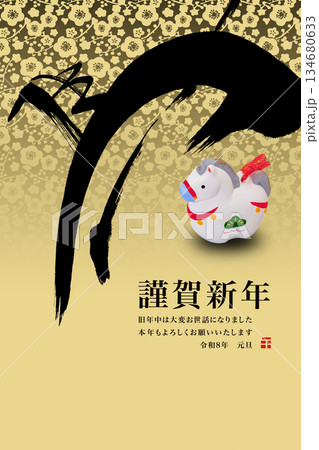 年賀状2026 年賀2026 午 午年 馬 干支 墨絵 水墨画 筆文字 和風 デザイン イラスト素材