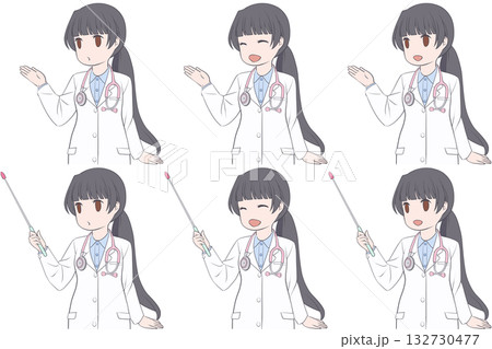 案内する女性医師、指し棒を持つ白衣の女性。説明する若い女性のクリップアート6点セット