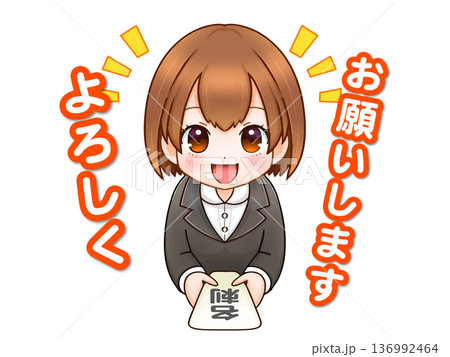 仕事で名刺交換する新入社員OLちゃんのイラスト素材2