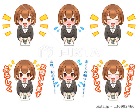 仕事で名刺交換する新入社員OLちゃんのイラスト素材セット2