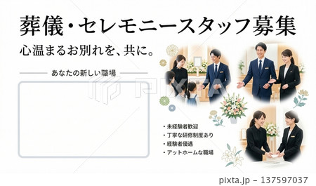 葬儀・セレモニースタッフの求人募集バナーテンプレート(リアルな人物・複数シーン・コピースペース)