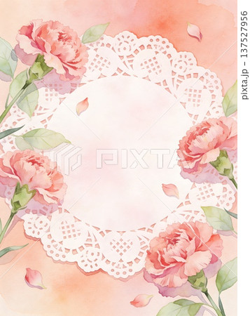 明るいピンクのカーネーションとレースのフレーム(母の日・ギフト向け背景)