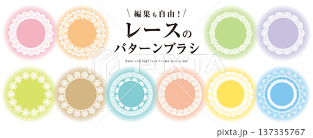 編集可能! レースのパターンブラシによるフレーム素材セット(ドイリー、枠、丸いフレーム)/パステル