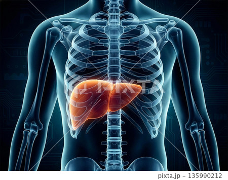 骨格モデルと肝臓の強調イラスト 肝機能・健康診断広告用レントゲンイメージ