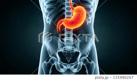 骨格モデルと胃の強調イラスト 胃腸薬・消化器科広告用レントゲンイメージ