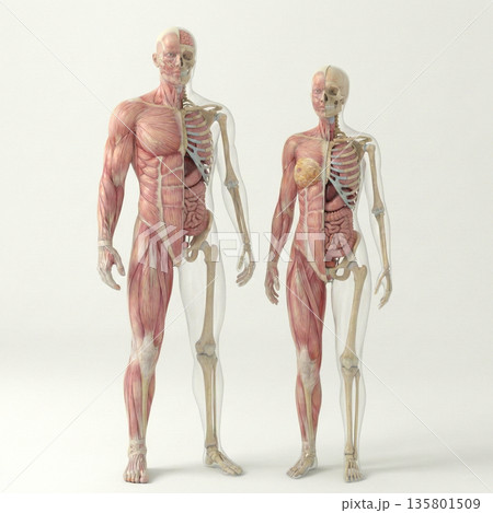 男女の筋肉標本と骨格内蔵標本 ハーフハーフ