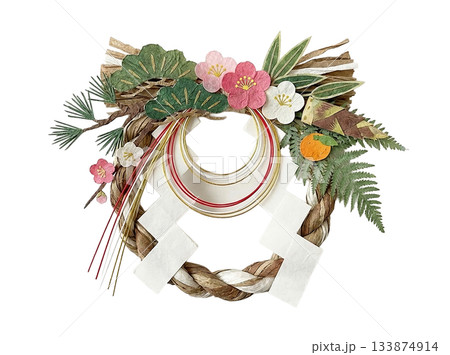 和紙で表現された梅・松・水引付き華やかなしめ縄飾り(切り絵風素材)