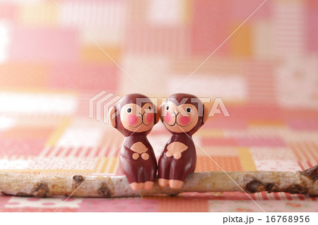 フェルトの猿のカップルと赤の背景