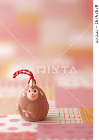 猿の人形とチェック柄の背景