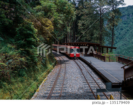The train stops at the Duigaoyue Railway Station in the Alishan National Forest Recreation Area of Chiayi in Taiwan.