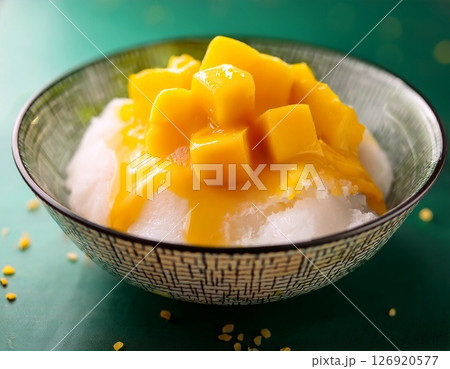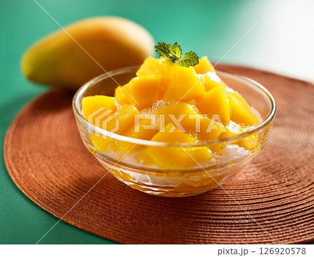 バニラアイスクリームと新鮮なマンゴーキューブがふんだんに乗った夏の贅沢かき氷 | 幻想的な雰囲気