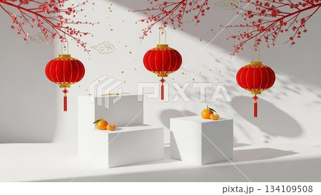 白い台座と赤い提灯、みかんのある中華圏の正月イメージ(3Dレンダリング風)
