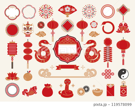 2025年中国の蛇年と旧正月の装飾とアイコンのイラスト セット
