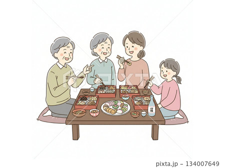 こども食堂で笑顔あふれる日本人の子供たち:カレーを食べる家族の食卓イラスト_家のテーブルイメージ