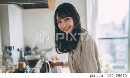 朝日の入るリビングでモーニングコーヒーを飲んでいる女性