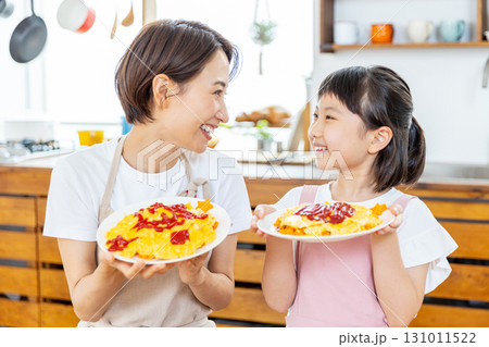 家族旅行・コテージ・バンガローで食事の支度をする母親・ママ・主婦