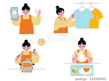 さまざまな家事ポーズをとる女性キャラクター、柔らかい色調、親しみやすい雰囲気、背景は白
