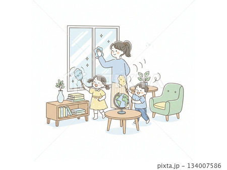 掃除を頑張る若い家族 お洒落でかわいい手描き線画イラスト