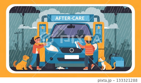 笑顔で頑張る!子供と犬と車の雨中アフターケア