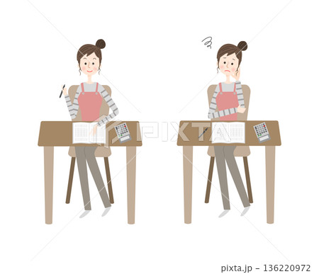 家計簿を付け、出費に気に病む40代女性のイラスト