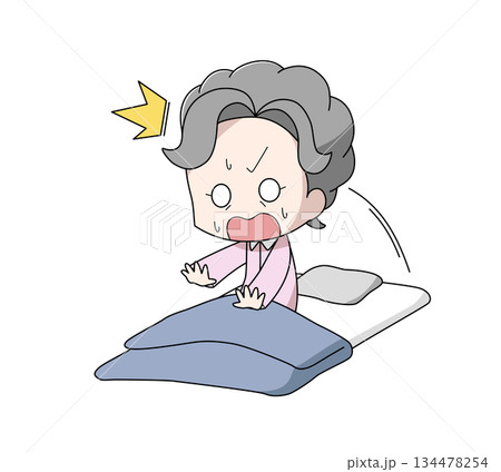 ベッドから起き上がるパジャマ姿の高齢女性と介護ベッド