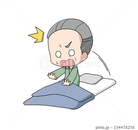 ベッドから起き上がるパジャマ姿で睡眠に悩む高齢男性と介護ベッド