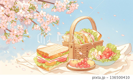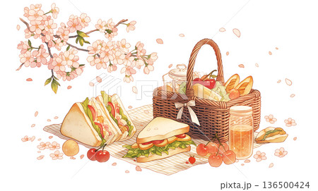 自然あふれる草原でのランチ風景、春の花に包まれた公園で過ごす休日、お弁当やバスケットが並ぶレジャー