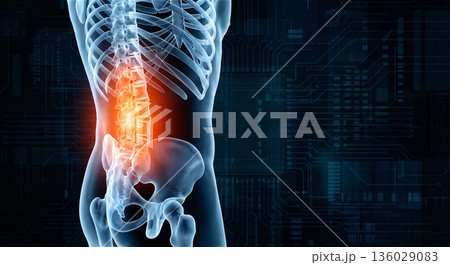 腰痛と椎間板ヘルニアのイラスト 腰・背骨の骨格レントゲン 3DCG 広告素材