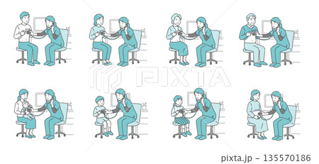 スクラブを着た女性医療従事者(医師・看護師)による聴診・診察のイラストセット(老若男女・妊婦・乳児)
