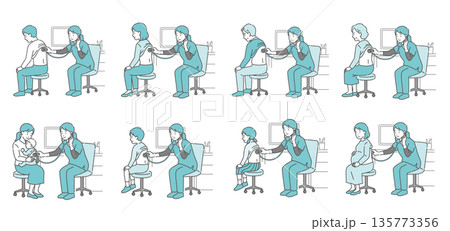 スクラブを着用した女性医療従事者による背中の聴診イラスト8点セット(老若男女・妊婦・乳児)