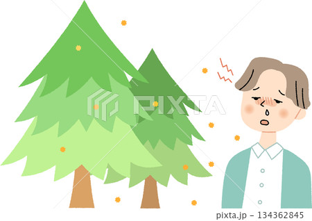 花粉を出す杉の木と鼻水が出る男性単色